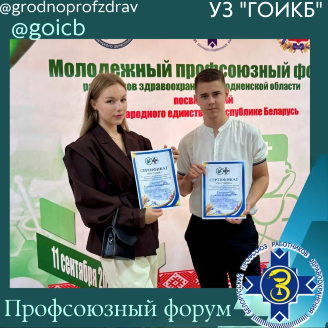 1️⃣1️⃣сентября молодые специалисты Алексей Сидоренко и Валерия Грасевич приняли участие в Молодежном профсоюзном форуме, посвященному Дню народного единства, который собрал в Гродно молодых медиков из 40 учреждений.